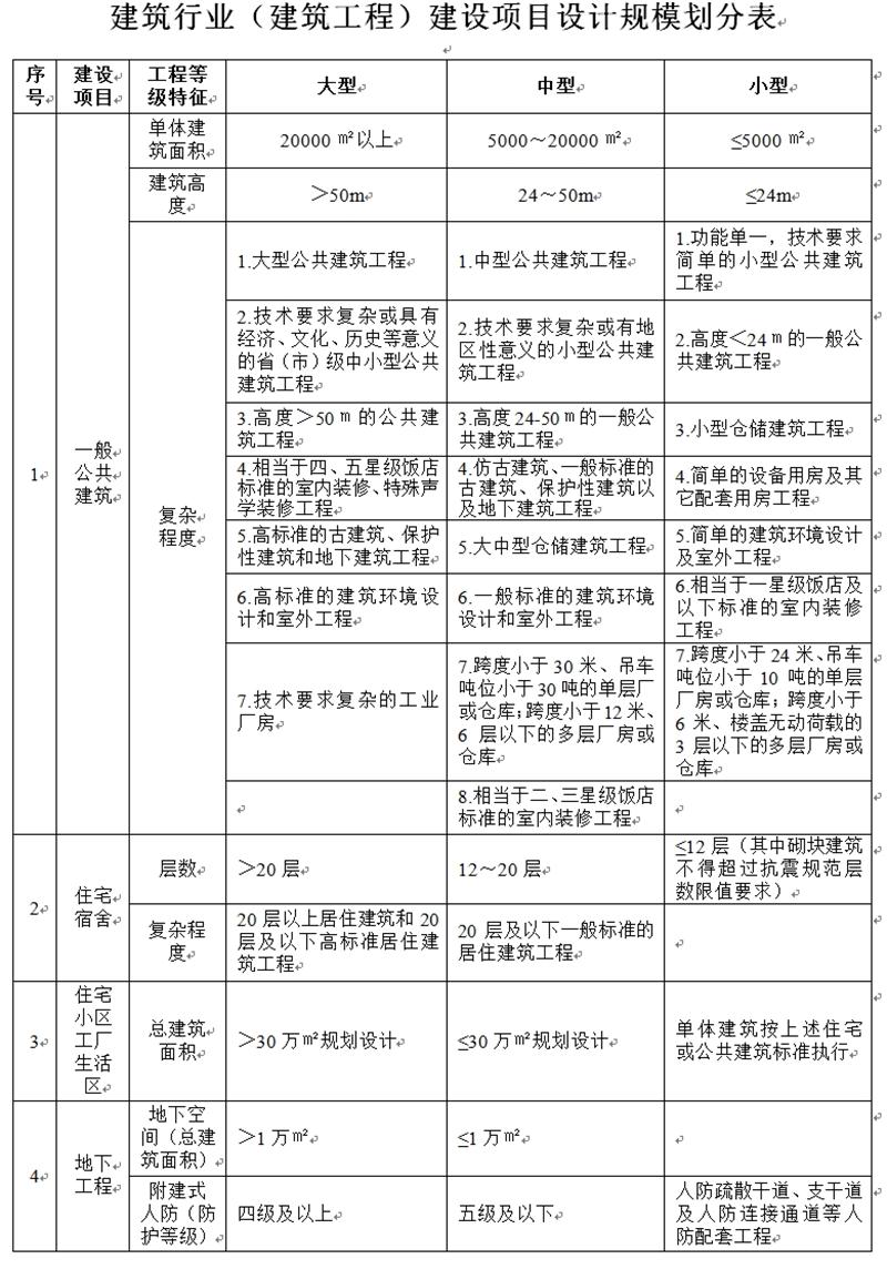 建筑行業(yè)(建筑工程)建設(shè)項(xiàng)目設(shè)計(jì)規(guī)模劃分表